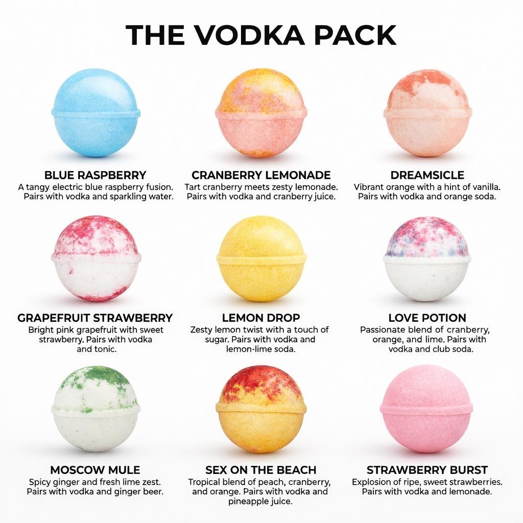 Say hello to our Vodka Pack, a vibrant selection of 9 unique cocktail bombs crafted to perfectly complement vodka. Whether you love citrusy, fruity, or bold flavors, this pack has something to match every mood and occasion.